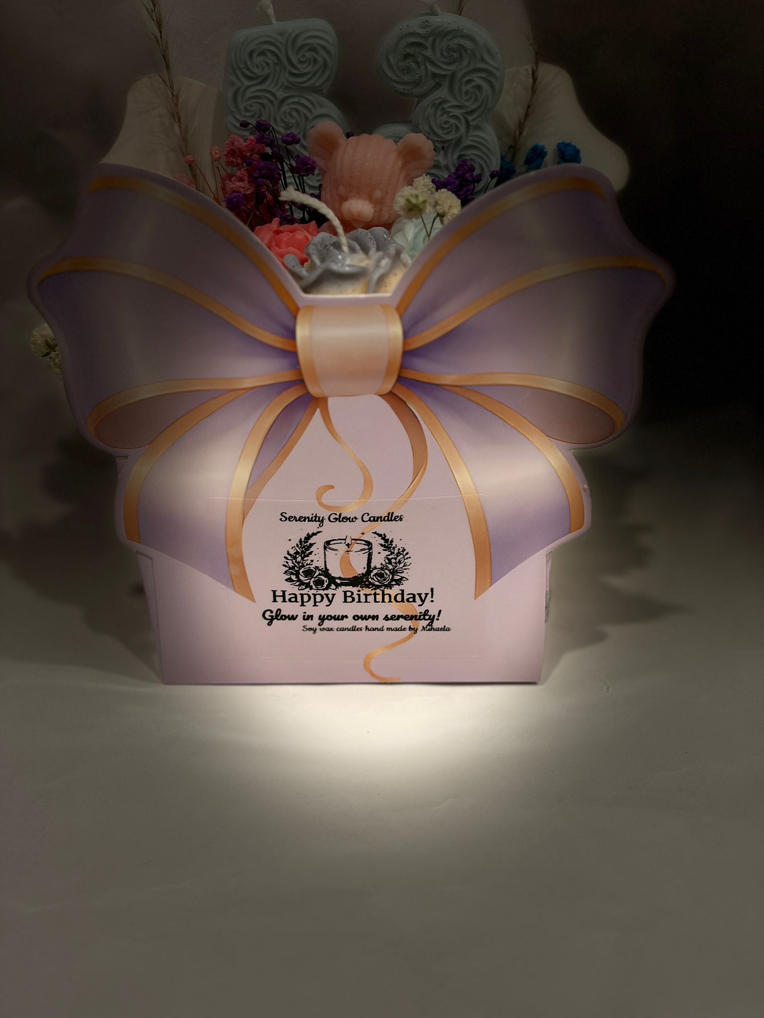 An exquisite handmade arrangement that combines sophistication with charm. Presented in an elegant gift box adorned with a luxurious ribbon bow, this stunning bouquet features handcrafted number candles and vibrant floral candles.