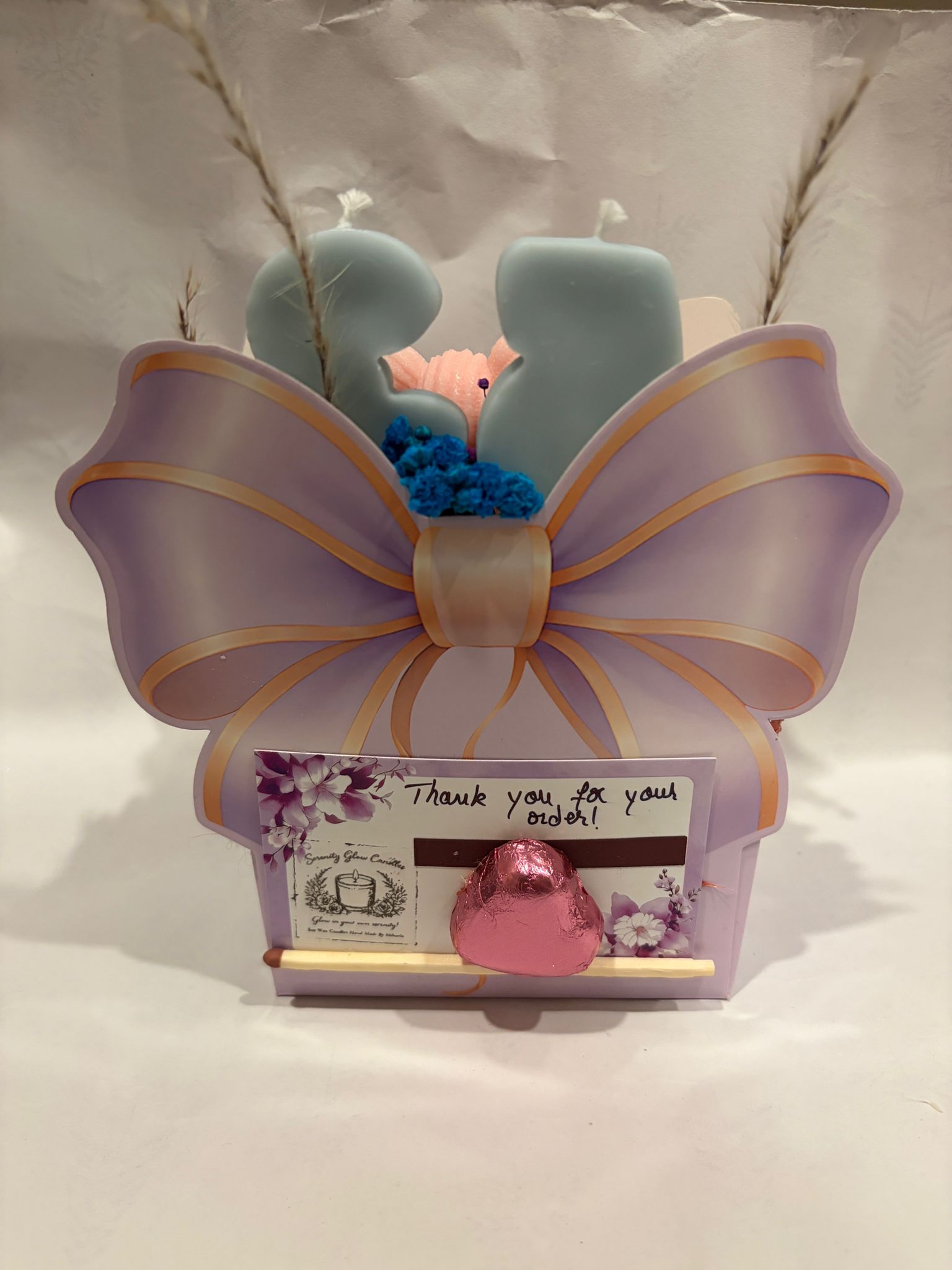 - Two handcrafted number candles (fully customizable age)