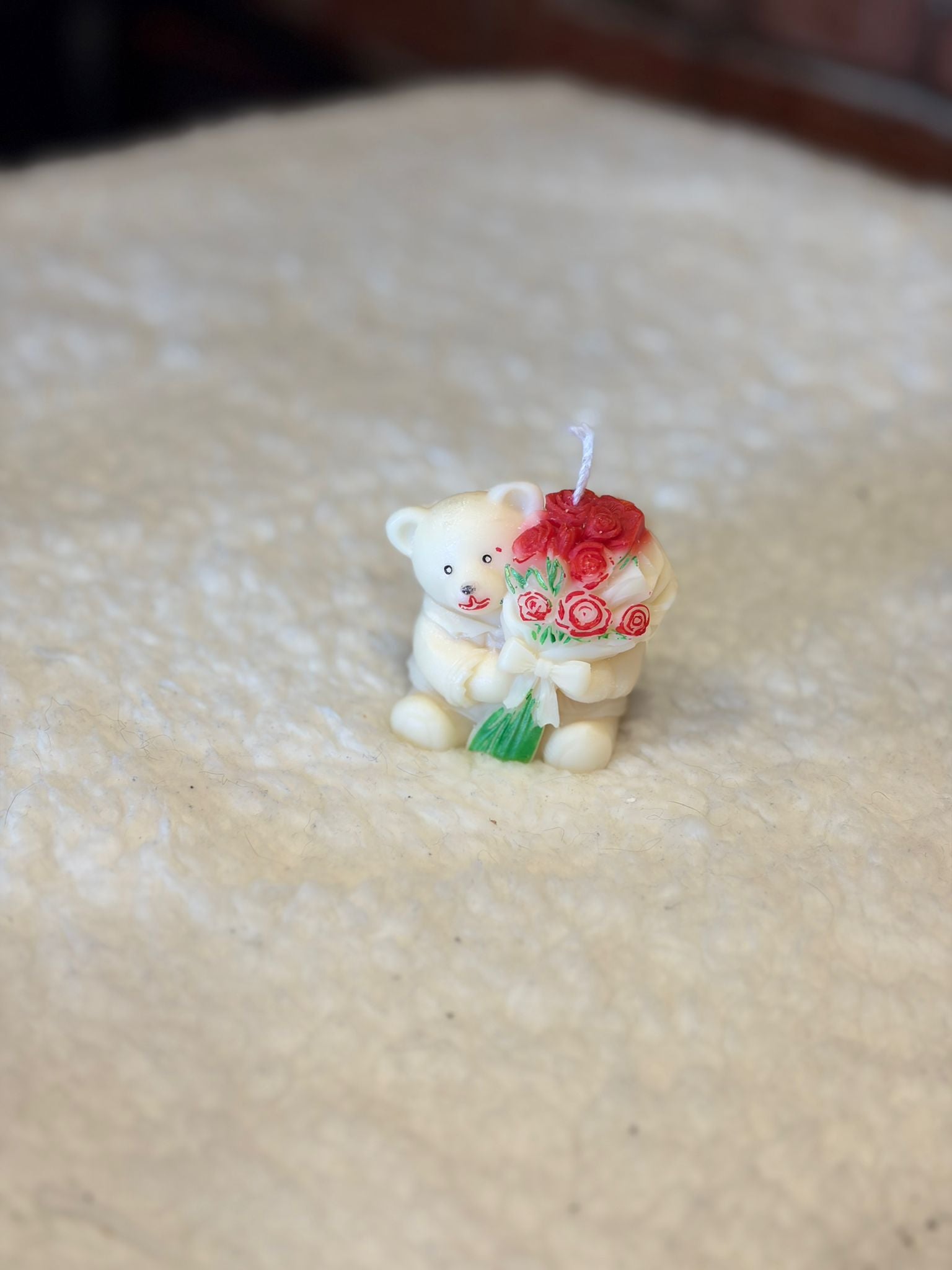 A charming handmade candle featuring a white teddy bear holding a bouquet of red roses, designed to add a romantic and elegant touch to any space. Carefully crafted with attention to detail, this piece makes a thoughtful gift or decorative accent for Mother's Day or special moments.